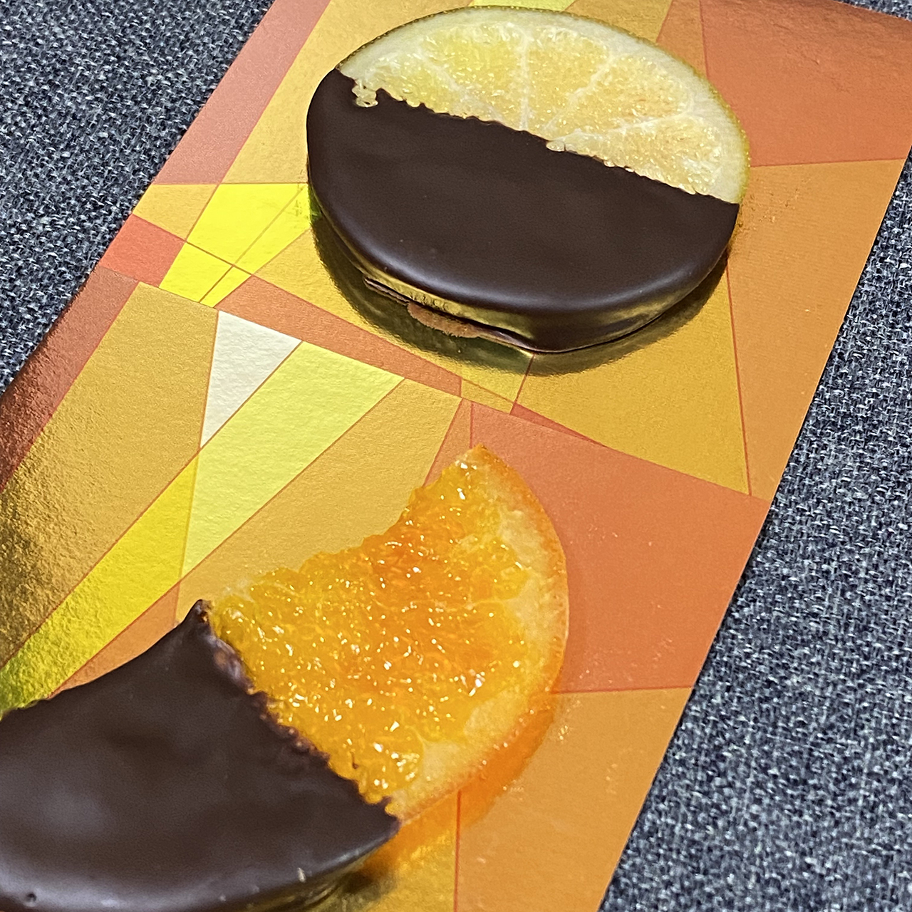 佐賀県生まれの柑橘「ひぜんユース」を早摘みしたものとチョコロンブスさんが作る「タンザニア キロンベロ カカオ70%」を合わせたオランジェット。