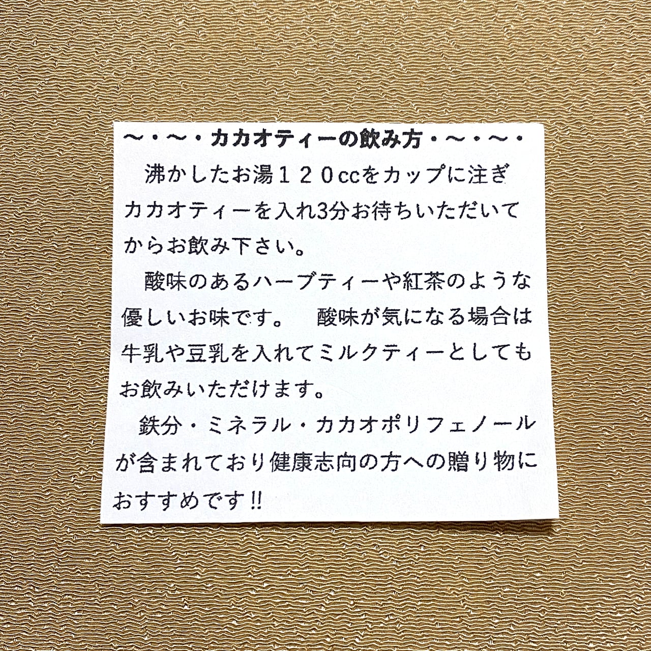 カカオの殻をそのままティーパックに詰めたお茶です。