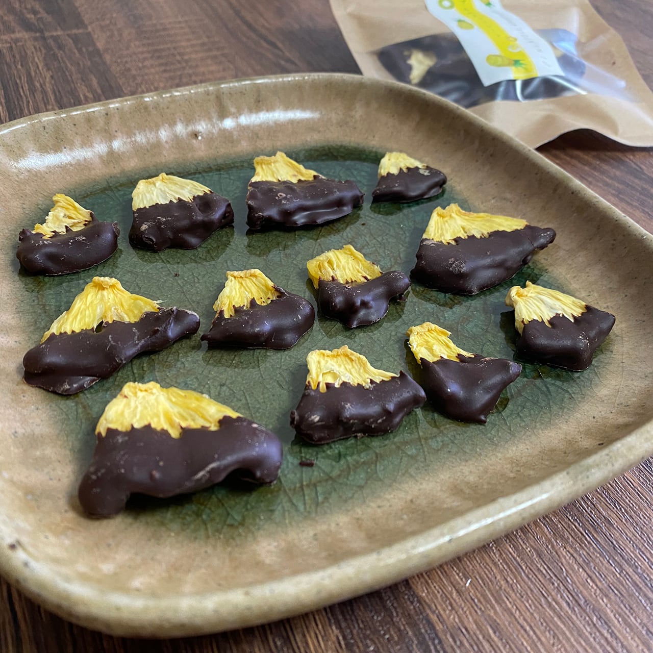 説明要らずに相性のいいパイナップルとチョコレートの組み合わせです。沖縄やんばるで採れたパイナップルをゆっくり乾燥させてドライフルーツに。使用するパイナップルは季節によって変わります。